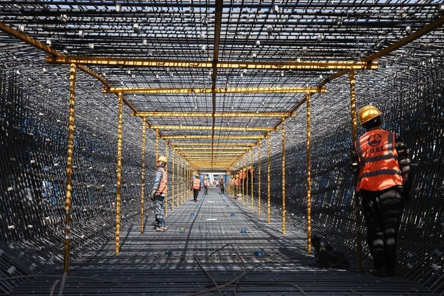在漳汕高铁东山制梁场,施工人员正在绑扎桥梁钢筋。李响摄