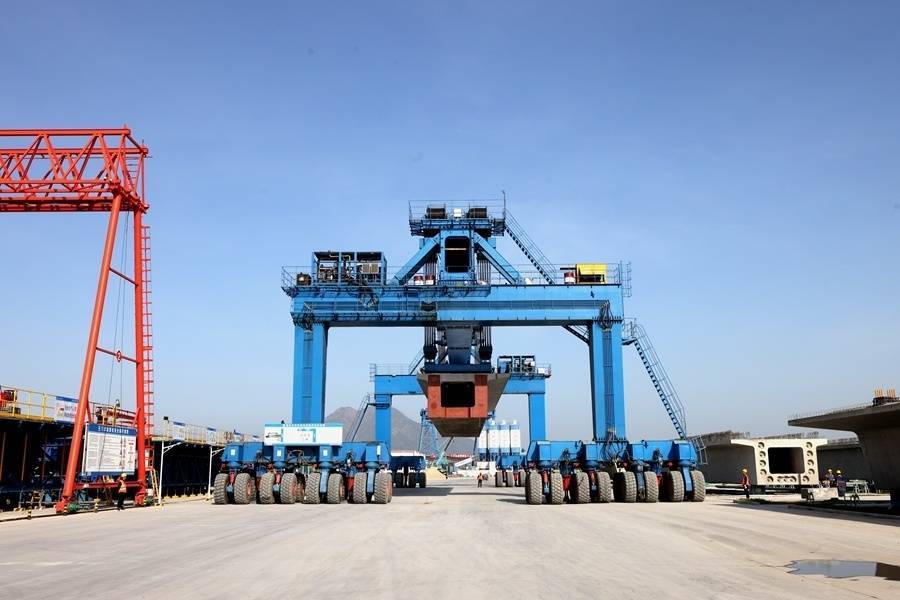 在漳汕高铁东山制梁场,搬运机器正在搬运箱梁。李响摄