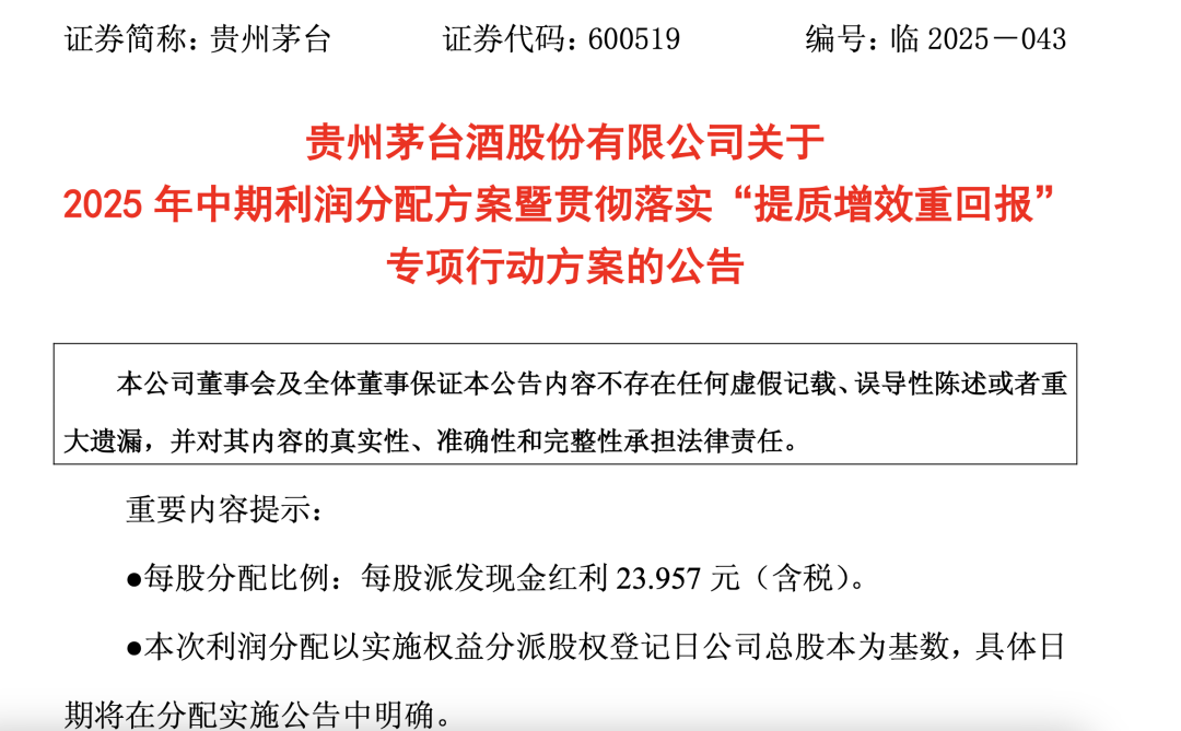 根据公告,贵州茅台拟向拟向全体股东每股派发现金红利23.957元(含税)。截至2025年9月30日,公司总股本为12.52亿股,以此计算,合计拟派发现金红利300.01亿元(含税)。