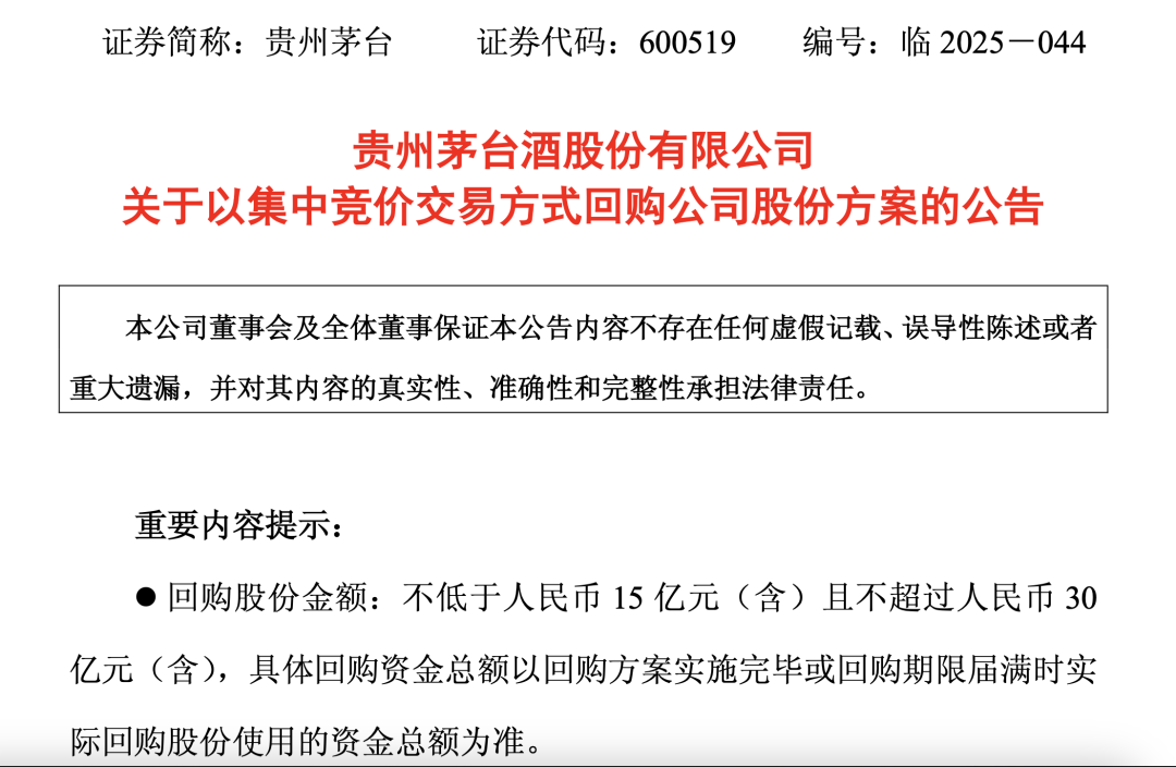 贵州茅台表示,此次回购目的旨在“维护公司及广大投资者的利益,增强投资信心”,即使按30亿元上限计算,回购资金约占公司截至2025年9月30日总资产的0.98%、归属于上市公司股东净资产的1.17%、现金和现金等价物的1.88%。不会对经营、财务和长期发展产生重大影响。