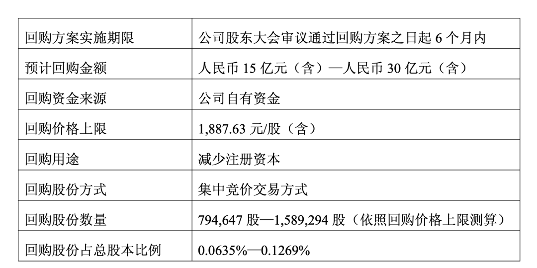 贵州茅台公告,本次回购资金总额上限为30亿元,回购价格上限设定为1887.63元/股。